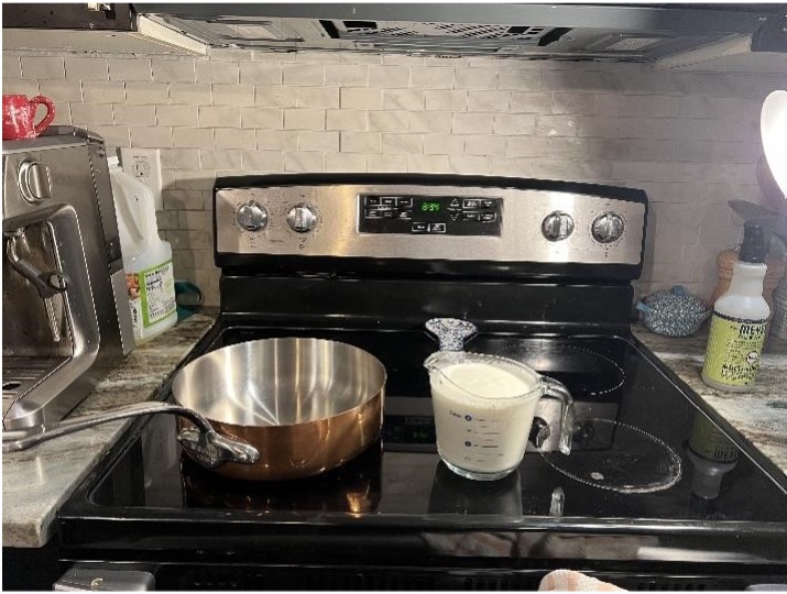 - Next, I’m going to place a sauce pan over medium-low heat and add the bowl containing the sugar, salt, and half and half. We’re going to whisk occasionally until it begins to steam. N.B.: a heat sensitive pan is critical here. I used my sauté pan because it’s copper, but a multi cladsauce pan will do wonders (plus, ours is on a fabulous sale).