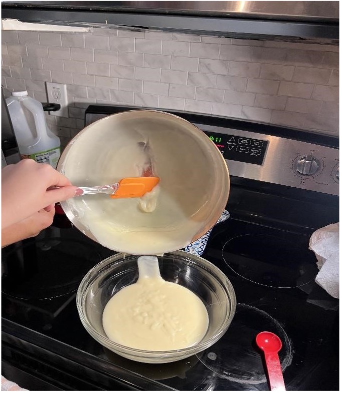 - When our half and half mixture begins to steam, we’re going to whisk the cornstarch bowl into the remaining half cup of half and half. We want our mixture to be well and thoroughly combined before adding it to the pan. Then, we will pour the mixture into the pan, stirring gently until it reaches a simmer.