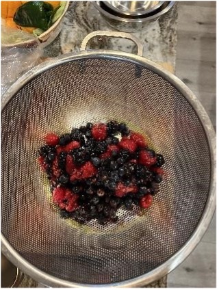 - When you’re about ready to top your tart, pour your mascerated berries in a strainer and set over a medium glass bowl. Take care to reserve the berry draining— it’s delicious and makes for a beautiful and flavorful addition to any tart.